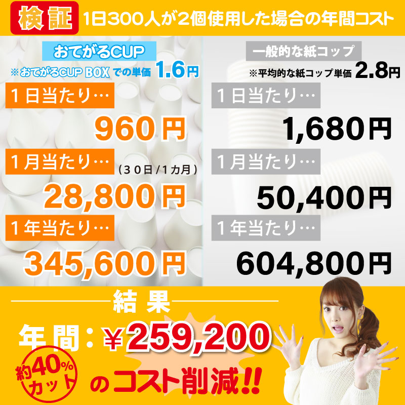 一般的な紙コップ(5オンスサイズ)に比べて3オンスサイズにすることで低価格を実現!たくさんの人が利用する病院などの公共施設やイベントでは、使えば使うほど一般的な紙コップに比べて断然お得になります!